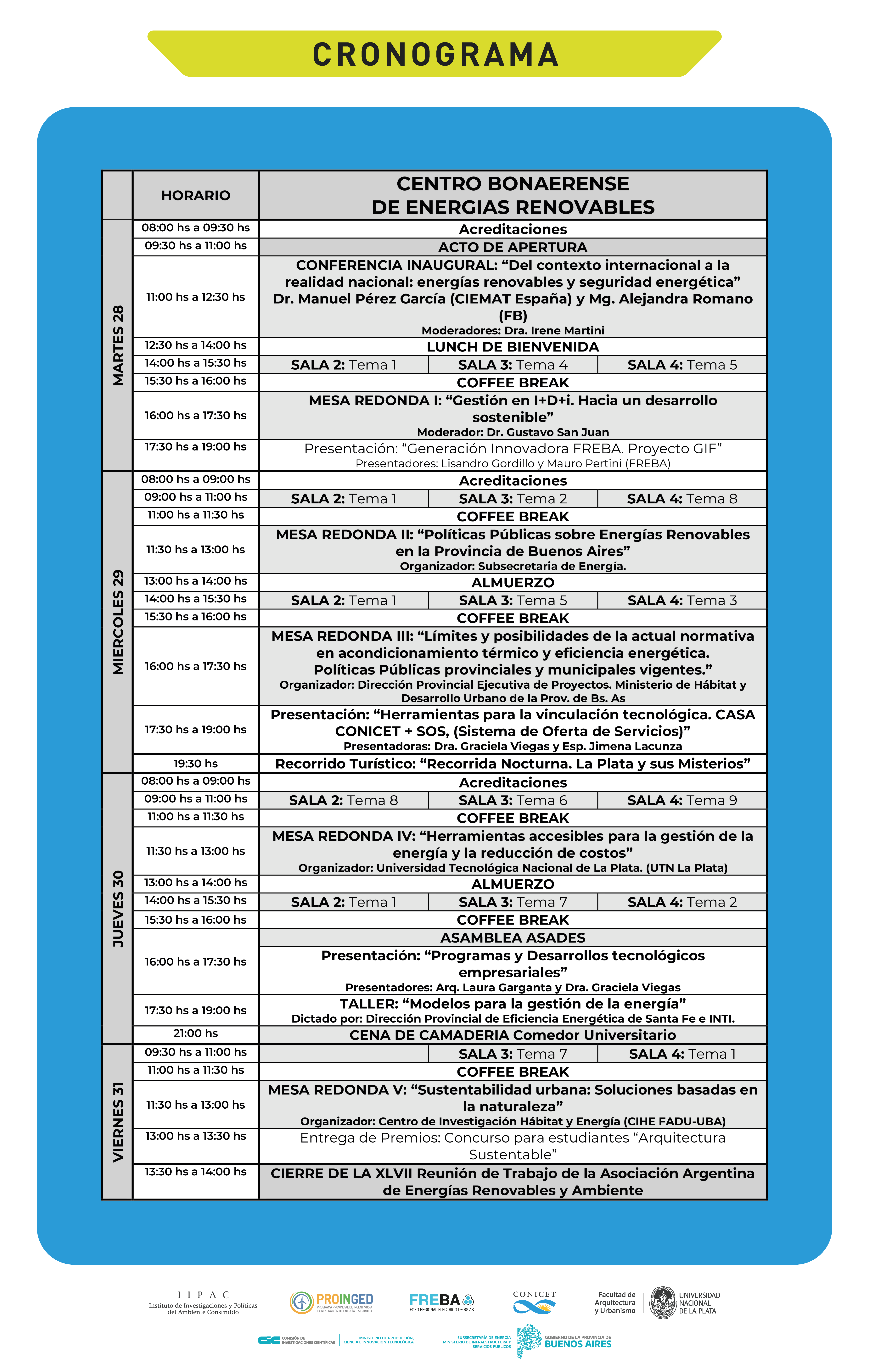 El cronograma tentativo de la XLVII Reunión de Trabajo de ASADES, estará disponible a partir del mes de Septiembre. El evento se desarrollará en el CAMPUS de la Comisión de Investigaciones Científicas (Camino Parque Centenario e/ 505 y 508) entre los días 28 de octubre y 31 de Octubre de 2025.